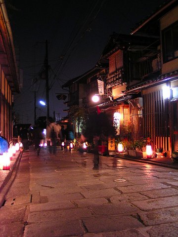 露地行灯と店の灯りが石畳を照らす