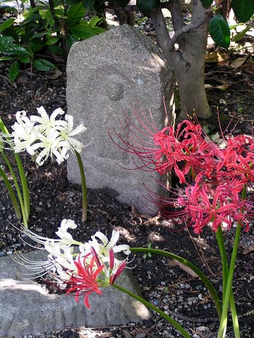 ひっそり佇む石仏の横に咲く彼岸花