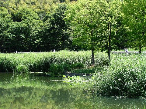 水辺の植物で覆われた山田池