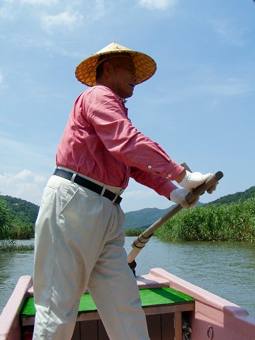 6人乗りの和船を船頭さんが手こぎで櫓を操る