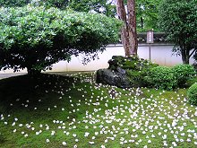 | 東林院 1531(享禄4)年、細川氏綱が父・高国公の菩提を弔うために建立した三友院に始まる。現在は妙心寺の塔頭寺院、山名家の菩提寺となっている。 東林院は沙羅双樹の庭園の寺として有名で、沙羅の開花時期(6月中旬〜下旬)のみ公開される。庭園には樹齢300年といわれる沙羅が植えられ、周囲には真っ白な散り花が美しい。沙羅の花は一日だけの命。与えられた一日だけの生命を精一杯咲きつくしている姿をそっと眺めたい。 拝観料:1500円(抹茶付き)、昼食に精進料理も味わえる(5000円) |