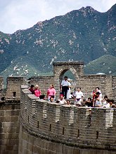 | 万里の長城 宇宙から見える地球上で唯一の建造物といわれる。もとは、紀元前数世紀ごろに中国各地に分立していた国々が、北方の騎馬民族や他国の侵入に対して築いた防壁を、中国を統一した秦の始皇帝がつなげて強化したものだ。30万の軍兵と数百万人の農民を駆り出したという。 外敵からの防御が目的とはいえ、山々の峰を伝って延々と続く城壁には圧倒される。長城は都を守る重要な要塞として、煉瓦で頑丈に築かれ、城壁には銃眼も開けられている。 その後数回にわたって修復され、八達嶺長城をはじめ4カ所の長城を歩くことができる。 私たちは八達嶺長城を観光。バスを降りて10分ほど歩くと入口にやってくる。入口を入って2ルートに分かれる。右へとればやや緩やかな女坂、左は男坂。眺めは男坂のほうが良いと聞いていたので男坂に挑戦した。雄大な景色を堪能することができた。 |