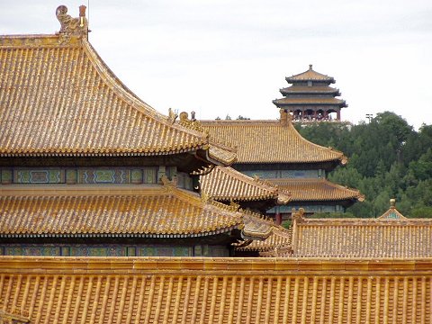 屋根の重なりや瓦の色が美しい。後ろは景山公園
