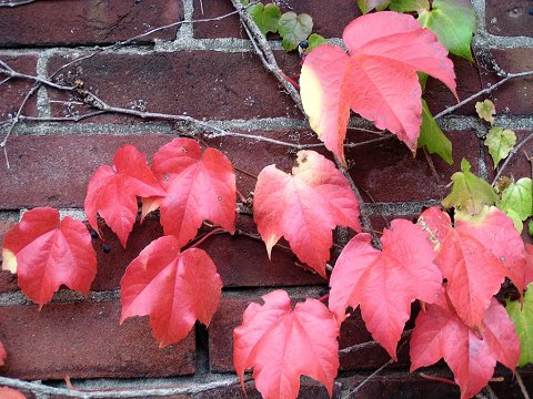 レンガに絡んだ真っ赤なツタが美しかった