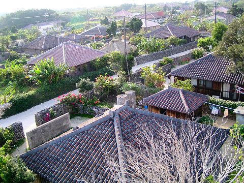 赤瓦の平屋建ての家が並ぶ