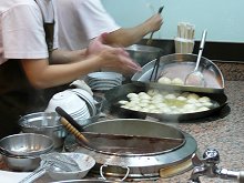 | 油餅を作っています | 好みのトッピングで食べます | 油餅とぜんざい |